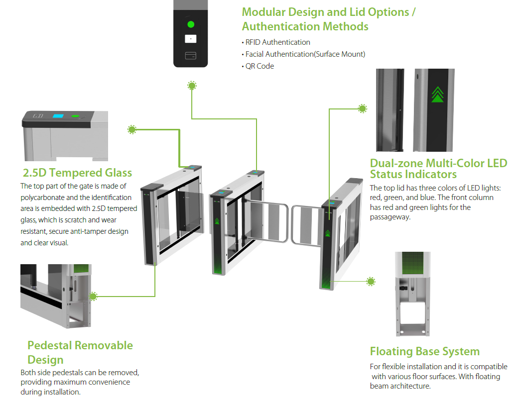 | Visual Indicator | Top LED indicator: Blue=Door closed/stand by Green=Door opening Red=Door closing/alarm Side LED indicator: Green=Lane available Red=Lane unavailable |