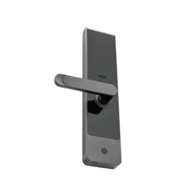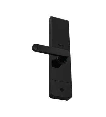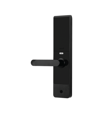 The SL01-T430H is a mortise-style door lock with a lever handle. It has a fingerprint sensor and supports remote locking and unlocking via a mobile device.