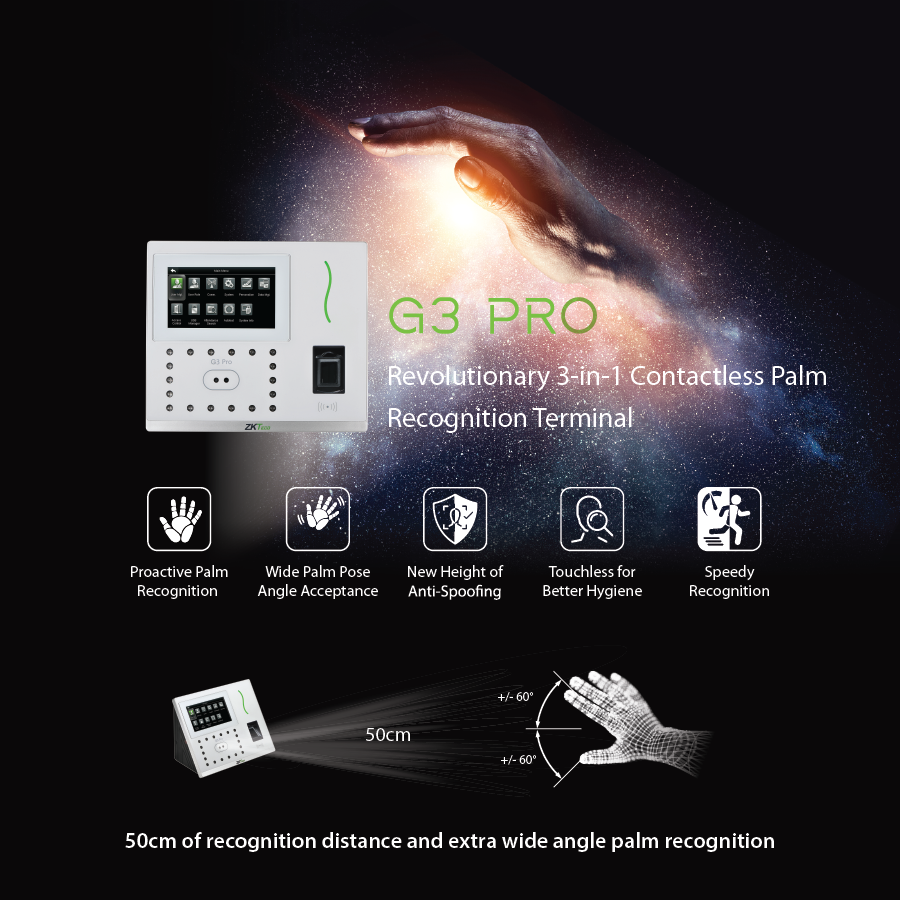 ZKTeco released the latest time attendance and access control terminal that is powered by Computer Vision technology like 3-in-1 contactless palm recognition which can perform bio-authentication with the user’s palm vein, palm print, and the shape of palm at the same time once the sensor detects a hand presented.