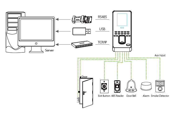 3rd Party Electric Lock, Door Sensor, Exit Button, Alarm, Doorbell, Wiegand In/Out |
