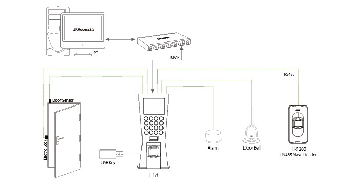 The F18 features the fastest commercial-based fingerprint matching algorithm and ZK high-performance, high-image quality infrared detection fingerprint sensor. The device offers flexibility to be INSTALLED standalone or with any third party access control panels’ .that support standard Wiegand signal. All the operations can be done on the TFT-LCD color screen. The fingerprint image will be displayed on it. That will guide user to put finger on proper position and increase recognition rate. TCP/IP and RS485 are available that the device can be used in different network