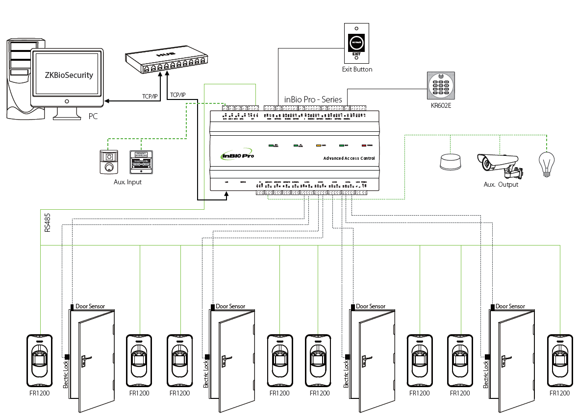 InBio Pro carries out the matching of fingerprints on the panels. The FR Series of readers transmit fingerprint templates to InBio Pro vis RS485 for fast and accurate matching with templates stored in the database. Wiegand inputs are also provided for traditional RFID readers.