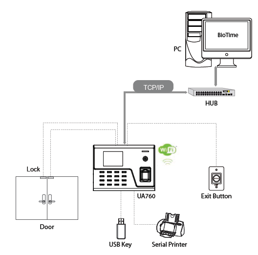 UA760 is a 2.8 inches color screen biometric terminal for Time & Attendance, and Access Control (primary) applications. It adopts BioID fingerprint collector for excellent recognition and internal WiFi for convenient communication. Users can manage data via TCP/IP, WiFi, and USB host port for data up/download to avoid the risk of accidental deletion. Besides, optional WDMS can achieve remote data management with our ZKTime.Net 3.0.