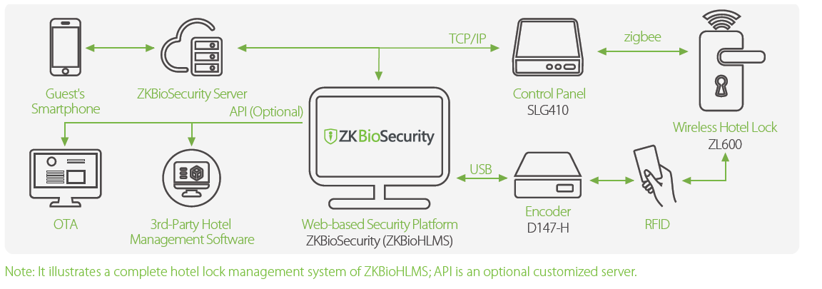 ZL600 is a wireless hotel door lock. The lock casing is made of SAE 304 stainless steel design which enhances its durability. ZL600 also passed the 96H salt spray test, the lock can withstand extreme weather conditions. ZL600 adopts a European Standard Mortise lock body, allowing users to unlock the door with smartphone HTML5 (H5), which ZKBioHLMS supports. Also, ZL600 works with zigbee communication, and users can control this smart hotel door lock locally and remotely.